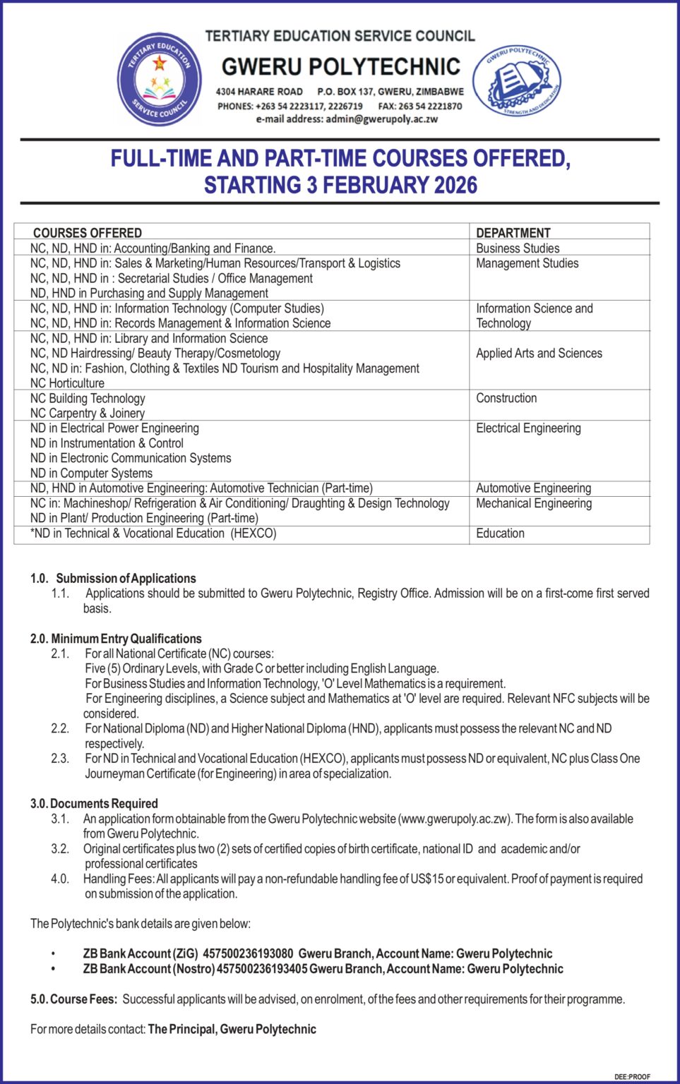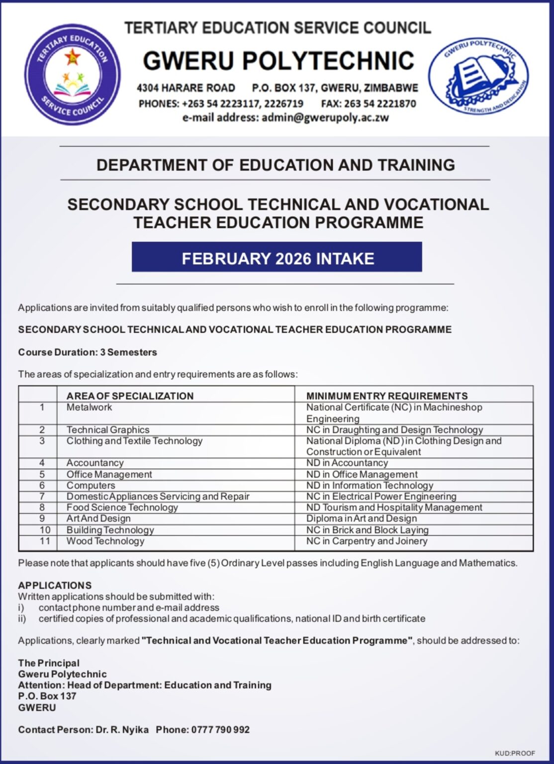 OPPORTUNITY CALLING: GWERU POLYTECHNIC READVERTISEMENT